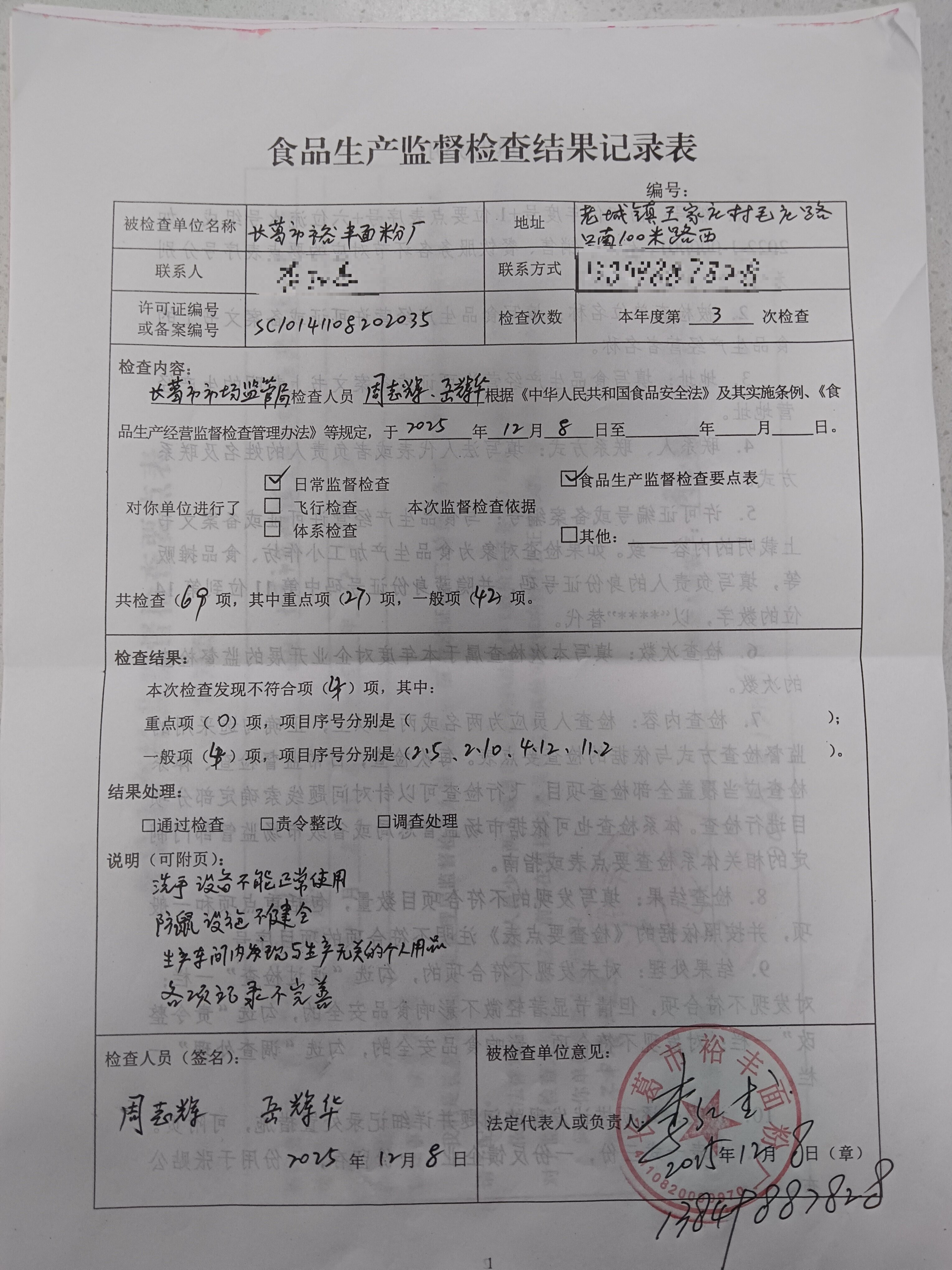 食品生产经营监督检查结果