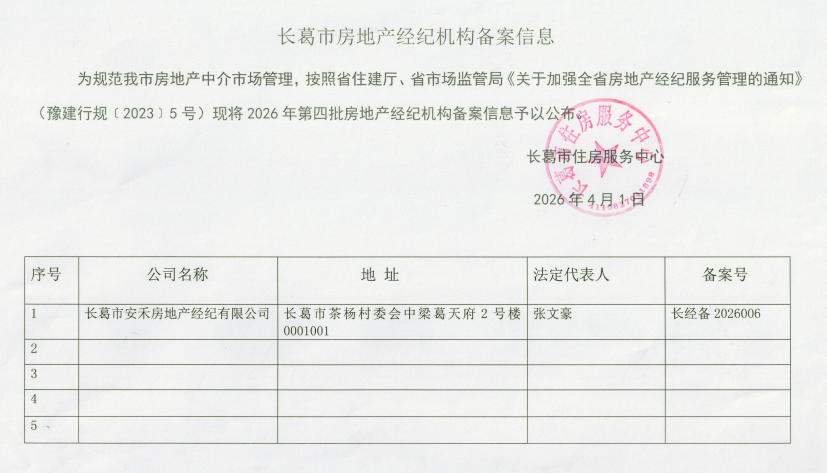 长葛市2026年房地产经纪机构第四批备案信息公示